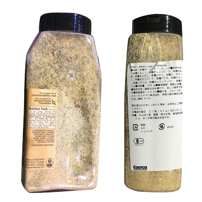 コストコ Costco ENGAGE オーガニック ガーリックシーズニング 675g(無塩) ORGANIC GARLIC SEASONING【ITEM/1050577】●名称/有機ガーリックシーズニング●原材料名/有機にんにく、有機オレンジピール、有機玉ねぎ、有機オレガノ、有機パセリ、有機ローズマリー、有機セロリシード、有機バジル、有機クミン、有機パプリカ、有機カイエンペッパー、有機タイム●内容量/675g ●賞味期限/側面に記載※ご注文後、最初の商品をコストコより取り寄せます。