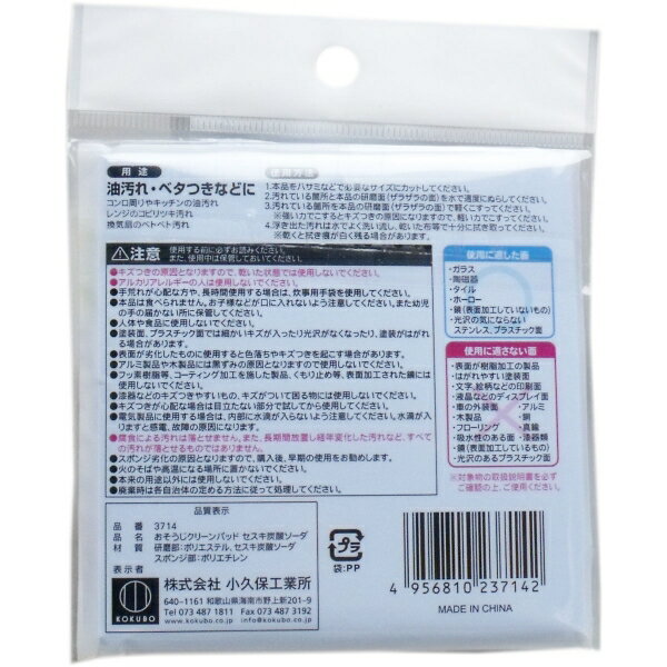 商品特徴一覧4956810-4、souz、jitan1912、4956810237142、通信販売、通販、販売、買う、購入、お店、売っている、ショッピング【おそうじクリーンパッド セスキ炭酸ソーダ】広告文責(有)イースクエアTEL:0120-532-772株式会社小久保工業所個装サイズ:120X145X7mm個装重量:約10g内容量:1個入製造国:中国【発売元:小久保工業所】【用途】油汚れ・ベタつきなどに・コンロ周りの油汚れ・レンジのコビリツキ汚れ・換気扇のベトベト汚れ【材質】研磨部・・・ポリエステル、セスキ炭酸ソーダスポンジ部・・・ポリエチレン【使用方法】(1)本品をはさみなどで必要なサイズにカットしてください。