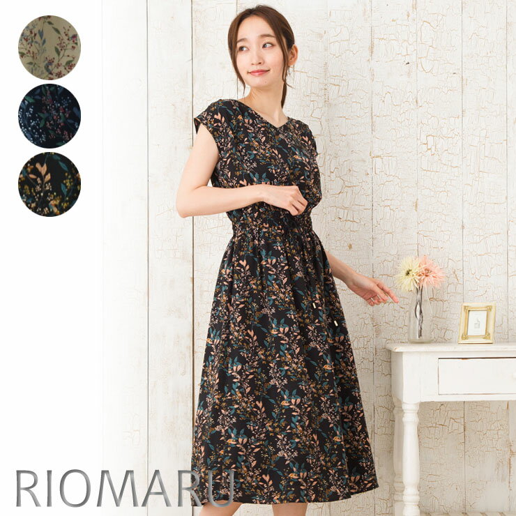 ワンピース レディース 夏 ◆【SALE30】【メール便 送料無料12】【7〜13号】合繊 リーフ柄 ロング 丈 フレンチ袖 ワンピース ( ウエスト ゴム )( 引き紐 付き )【エコ包装】[op][ オフィス カジュアル ビジネス 母 ママ 春 夏 秋 花柄 大きいサイズ ][hw]